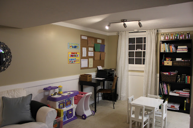 Keep in mind that I still have a list a mile long of things I'd like to do to finish up this space. We need a few new pieces of furniture. There are a few blank walls. More toys fill the room then I would prefer, but man do those toys keep my children entertained. :) Just thought we would share where the removal of the wall left us...
